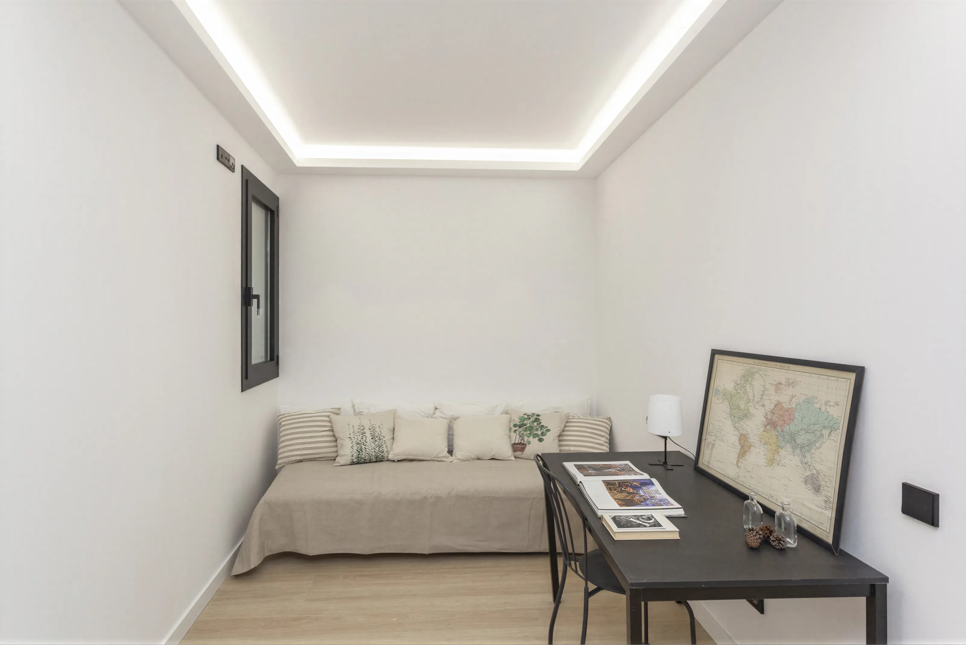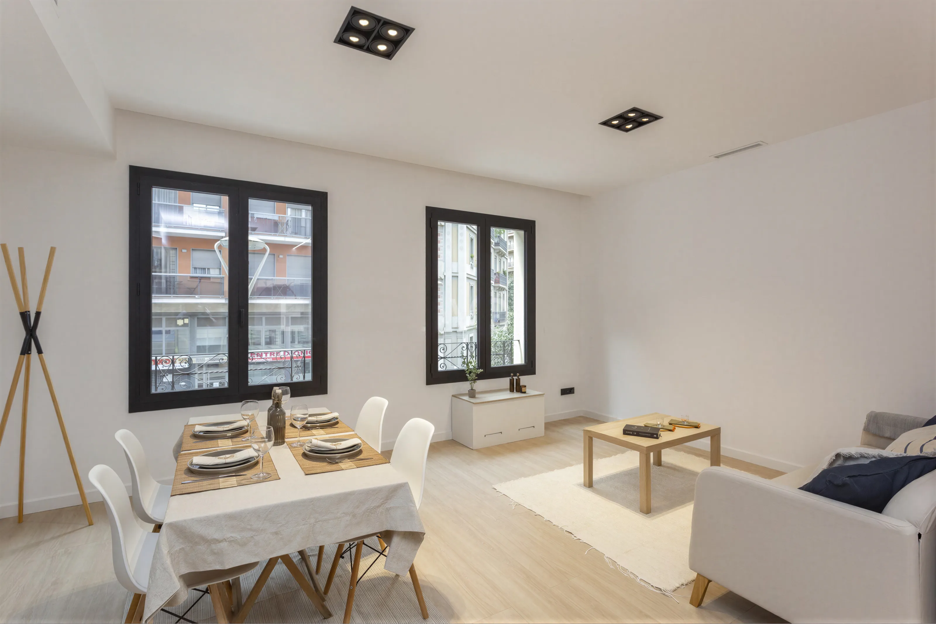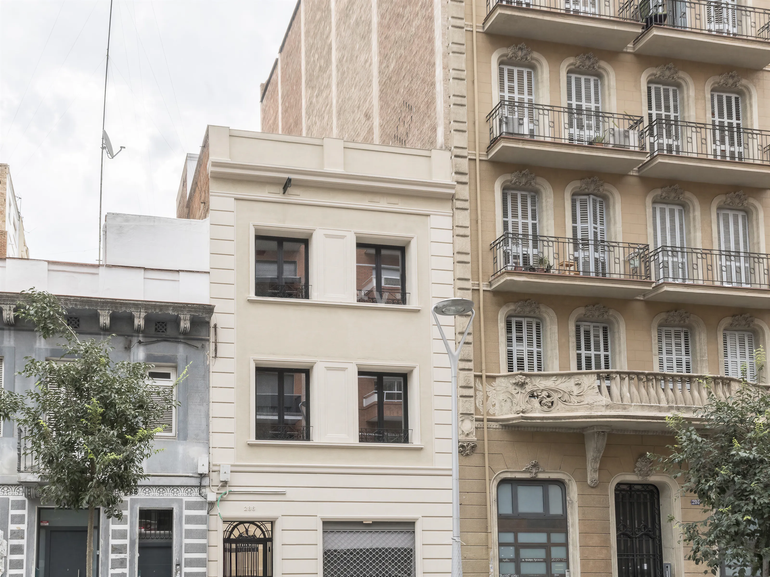 La fachada respeta el diseño original pero remarca su caracter renovado con carpinterías de aluminio en acabado negro mate que aportan una imagen moderna y elegante al conjunto, al tiempo que mejoran la eficiencia térmica y acústica del edificio.